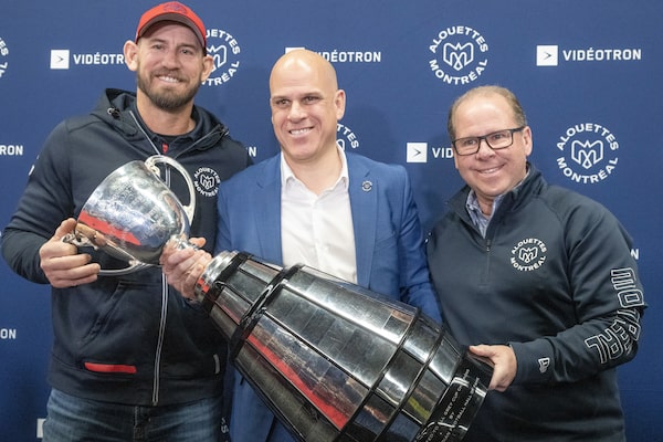 Montreal Alouettes head coach Jason Maas, left, president Mark Weightman, centre, and general manager Danny Maciocia hold the Grey Cup at their end-of-season press conference, in Montreal, on Nov. 29.Ryan Remiorz/The Canadian Press