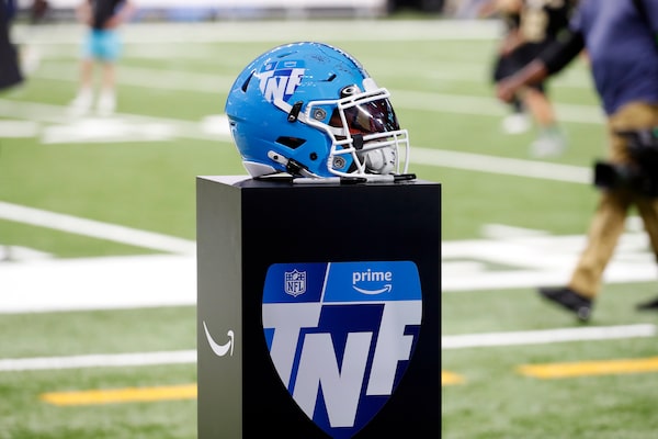 An autographed Amazon Prime Thursday Night Football helmet after an NFL football game between the New Orleans Saints and the Jacksonville Jaguars on Oct. 19 in New Orleans.Tyler Kaufman/The Associated Press
