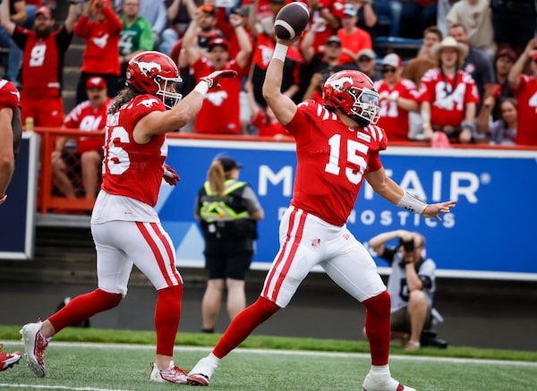 Calgary Stampeders quarterback Jake Maier, right, celebrates his touchdown during first half CFL football action against the Toronto Argonauts in Calgary. The Stamps won 20-7 on Aug. 4, 2023.Jeff McIntosh/The Canadian Press