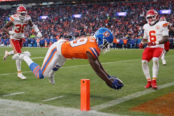 Marvin Mims Jr. of the Denver Broncos dives to score a touchdown in the third quarter against Kansas City on Jan. 5 in Denver.Matthew Stockman/Getty Images
