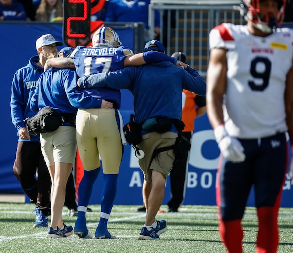 Winnipeg Blue Bombers quarterback Chris Streveler (17) was injured in a game against the Montreal Alouettes in Winnipeg, Saturday, Oct. 25, 2025.John Woods/The Canadian Press