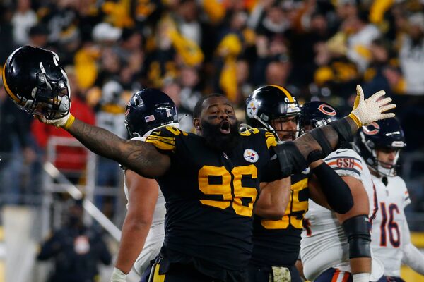 Isaiah Buggs of the Pittsburgh Steelers celebrates the 29-27 win against the Chicago Bears at Heinz Field on Nov. 8, 2021 in Pittsburgh.Justin K.Aller/Getty Images