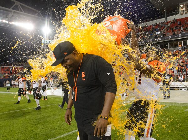 BC Lions head coach DeVone Claybrooks gets a gatorade shower to celebrate the team's win after CFL football action against the Toronto Argonauts, in Toronto, on Saturday, July 6, 2019. THE CANADIAN PRESS/Andrew LahodynskyjAndrew Lahodynskyj/The Canadian Press