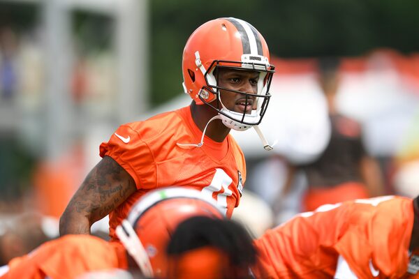 He waved toward cheering fans while he and his teammates began their stretching period before practice Monday in Berea, Ohio. “We got your back, Watson!” yelled one.