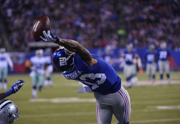 Odell Beckham Jr. of the New York Giants, makes a one-handed catch during a game at MetLife Stadium in East Rutherford, N.J., Nov. 23, 2014. A year after signing Beckham to one of the largest contracts for a wide receiver in NFL history, the Giants in 2019 have agreed to trade him to the Cleveland Browns.BARTON SILVERMAN/The New York Times News Service