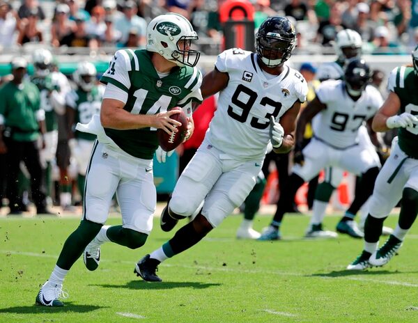 New York Jets quarterback Sam Darnold, left, looks for a receiver as he is pressured by Jacksonville Jaguars defensive tackle Calais Campbell (93) during the first half of an NFL football game, Sept. 30, 2018, in Jacksonville, Fla.John Raoux/The Associated Press