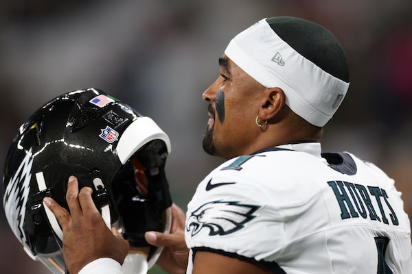Philadelphia Eagles quarterback Jalen Hurts (1) watches during warm ups before an NFL football game between the Philadelphia Eagles and the Green Bay Packers on Sept. 6 at the Neo Quimica Arena in Sao Paulo.Gregory Payan/The Associated Press