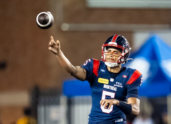 Montreal Alouettes quarterback Caleb Evans throws the ball during a Friday home game against the Edmonton Elks.Christopher Katsarov/The Canadian Press