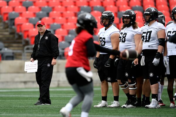 Ottawa Redblacks head coach Paul LaPolice watches quarterback Jeremiah Masoli as he participates in the team’s training camp in Ottawa on May 19, 2022.Justin Tang/The Canadian Press