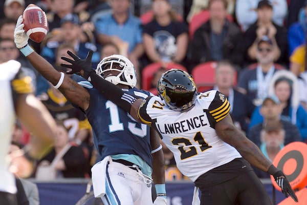 Then-Toronto Argonauts slotback S.J. Green catches a pass during a game against Hamilton Tiger-Cats, in Toronto, on June 25, 2017.Frank Gunn/The Canadian Press