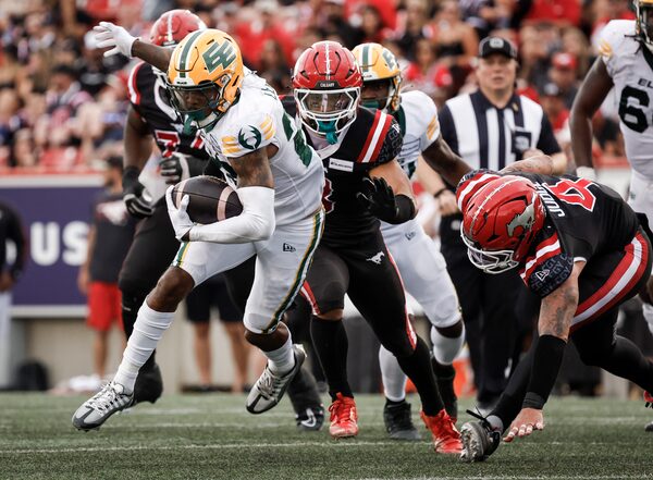 Edmonton Elks' Javon Leake escapes a tackle from Calgary Stampeders' Cameron Judge in Calgary on Sept. 2, 2024.Jeff McIntosh/The Canadian Press