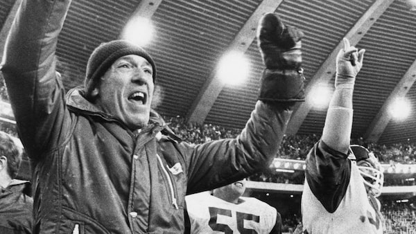 Then-Montreal Alouettes coach Marv Levy celebrates the Alouettes' win over the Edmonton Eskimos in the 1977 Grey Cup at Montreal's Olympic Stadium.stf