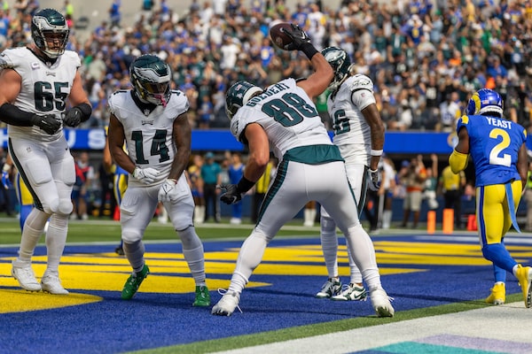 Philadelphia Eagles tight end Dallas Goedert (88) catches a touchdown and spikes the ball and celebrates with teammates against the Los Angeles Rams in an NFL football game on Oct. 8, in Inglewood, Calif.Jeff Lewis/The Associated Press