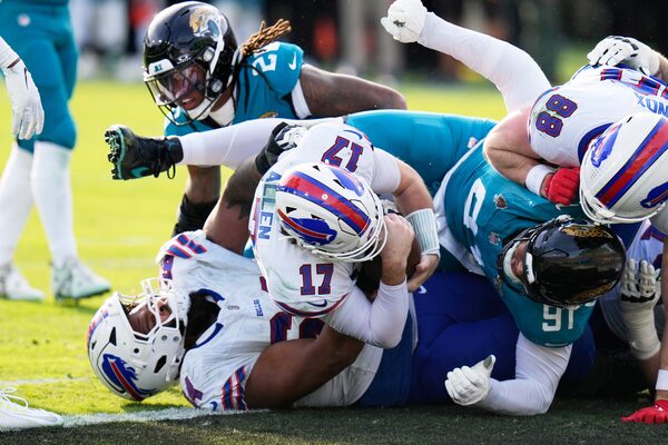 Focused on getting rid of the ball quickly and negating Jacksonville’s pass rush most of the game, Allen completed 28 of 35 passes for 273 yards and a touchdown. He ran for two scores, was sacked just once and played turnover-free football. Khalil Shakir caught 12 passes for 82 yards for the Bills.