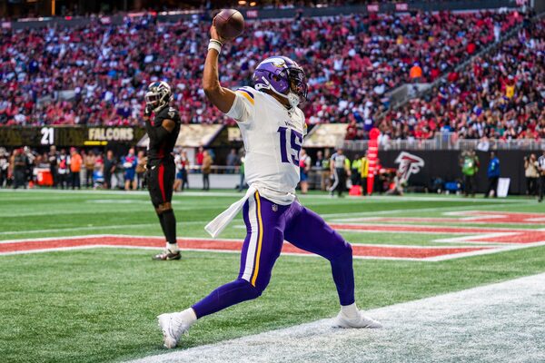 Minnesota Vikings quarterback Joshua Dobbs (15) celebrates a touchdown during the second half of an NFL football game against the Atlanta Falcons on Nov. 5 in Atlanta.Danny Karnik/The Associated Press
