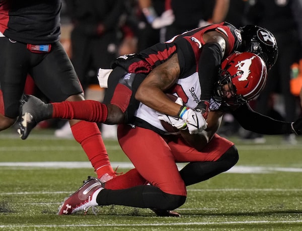 Ottawa Redblacks linebacker Frankie Griffin tackles Calgary Stampeders wide receiver Kamar Jorden during second half. The Stamps won 26-13 on Oct. 29, 2021 in Ottawa.Adrian Wyld/The Canadian Press
