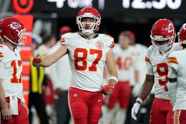 Kansas City tight end Travis Kelce looks up during the second half of a game against the Las Vegas Raiders in the final week of the NFL's 2025 regular season.John Locher/The Associated Press