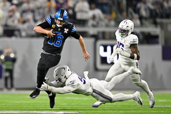 Jared Goff (16) of the Detroit Lions scrambles against Eric Wilson (55) of the Minnesota Vikings during a Christmas Day game this past season.Stephen Maturen/Getty Images