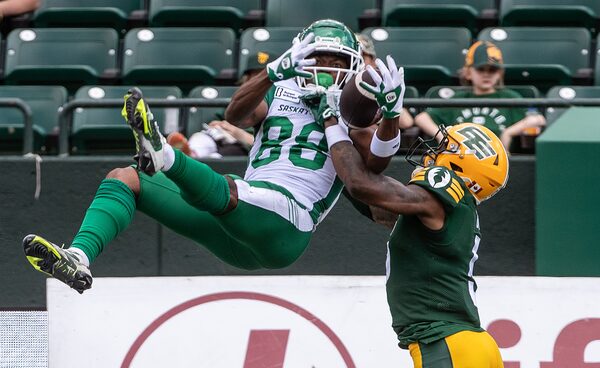 Saskatchewan Roughriders' Dohnte Meyers (88) makes the catch as Edmonton Elks' Kai Gray (5) tries to block the pass during first half CFL pre-season action in Edmonton, Alta., on May 25, 2024.JASON FRANSON/The Canadian Press