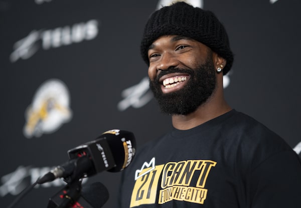 Hamilton Tiger Cats linebacker Simoni Lawrence speaks during a media availability in Hamilton, Ont., on Nov. 6, 2023.Peter Power/The Canadian Press