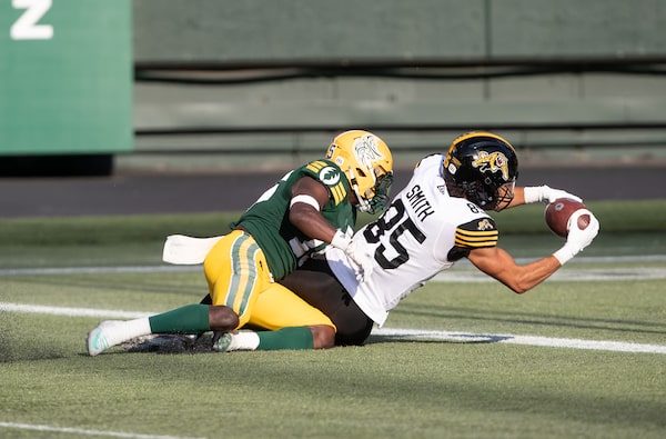 Hamilton Tiger-Cats' Kiondré Smith (85) scores a touchdown while being tackled by Edmonton Elks' Kai Gray (5) during second half CFL action in Edmonton on July 28.JASON FRANSON/The Canadian Press