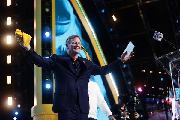 Goodell kicked off the night by walking on stage with Steelers stars T.J. Watt and Cam Heyward, earning the customary boos that greet him each year at the draft. The players waved yellow Terrible Towels while Goodell held his.