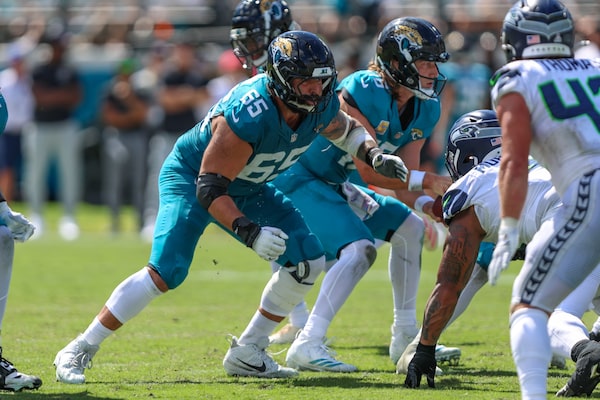 Jacksonville Jaguars offensive tackle Patrick Mekari (65) sets to block during a game against the Seattle Seahawks on Sunday in Jacksonville, Fla.Gary McCullough/The Associated Press
