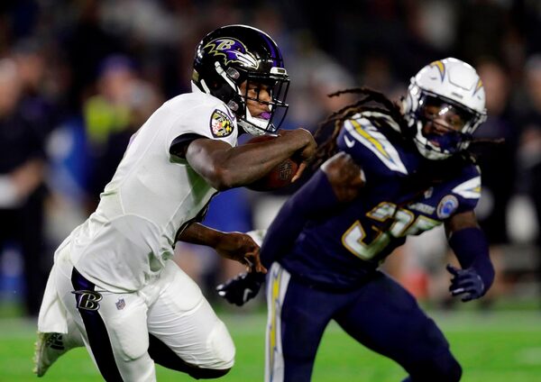 Baltimore Ravens quarterback Lamar Jackson running against the Los Angeles Chargers during an NFL football game in Carson, Calif., Dec. 22, 2018,The Associated Press