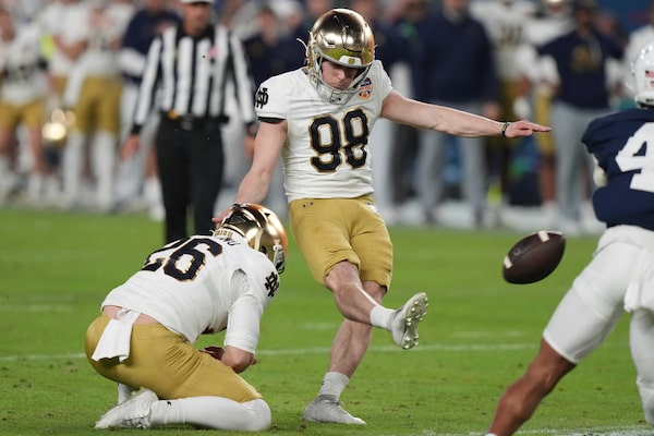 Notre Dame place kicker Mitch Jeter kicks the game winning field goal during the second half of the Orange Bowl College Football Playoff semifinal game against Penn State. Notre Dame won 27-24 on Jan. 9, 2025, in Miami Gardens, Fla.Lynne Sladky/The Associated Press