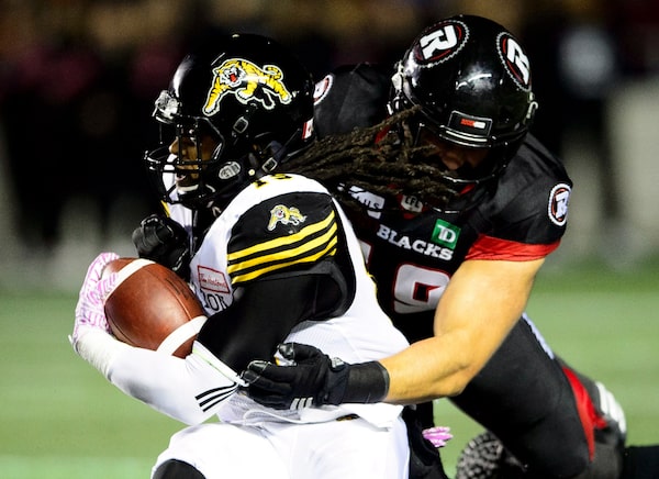 Ottawa Redblacks defensive lineman Ettore Lattanzio attempts a tackle on Hamilton Tiger-Cats wide receiver Kevin Elliott during a game on Oct. 19, 2018.Sean Kilpatrick/The Canadian Press