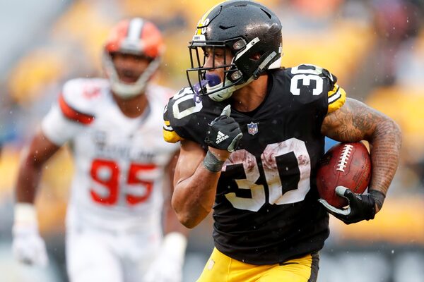 In this Sunday, Oct. 28, 2018, file photo, Pittsburgh Steelers running back James Conner (30) breaks away from Cleveland Browns defensive end Myles Garrett (95) for a touchdown in the second half of an NFL football game in Pittsburgh.Don Wright/The Associated Press