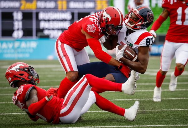 Montreal Alouettes receiver Geno Lewis, right, is tackled by Calgary Stampeders defensive back Kobe Williams, left, and defensive back Jonathan Moxey during the first half in Calgary. on June 9, 2022.Jeff McIntosh/The Canadian Press