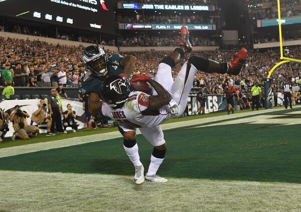 Philadelphia Eagles cornerback Ronald Darby pushes Atlanta Falcons wide receiver Julio Jones out of bounds on the final play of the game at Lincoln Financial Field.James Lang/USA TODAY Sports via Reuters