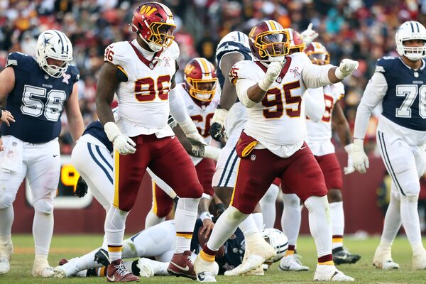 Washington Commanders defensive tackle Jer'Zhan Newton (95) celebrates during his game against the Dallas Cowboys on Thursday in Landover, Md.Daniel Kucin Jr./The Associated Press