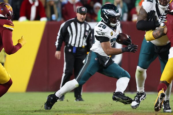Philadelphia Eagles running back Saquon Barkley (26) runs with the ball during a game against the Washington Commanders this past Saturday, in Landover, Md.Daniel Kucin Jr./The Associated Press