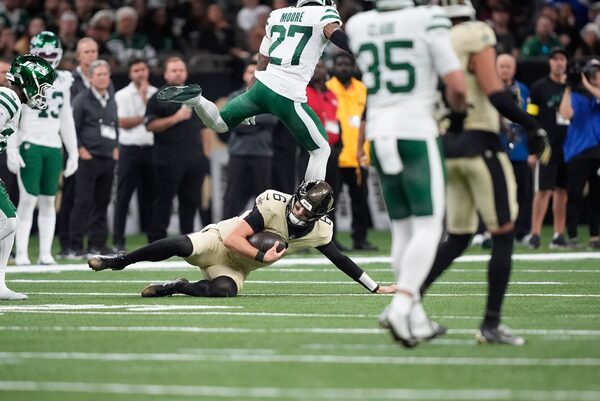 New Orleans Saints quarterback Tyler Shough (6) slides underneath New York Jets safety Malachi Moore (27) in the first half of their game this past Sunday in New Orleans.Gerald Herbert/The Associated Press
