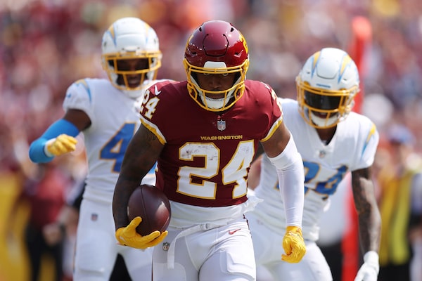 Antonio Gibson of the Washington Football Team carries the ball against the Los Angeles Chargers at FedExField on Sept. 12, 2021 in Landover, Maryland.Patrick Smith/Getty Images