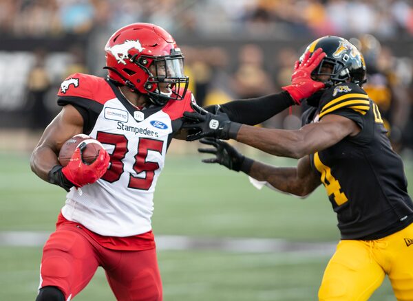 Calgary Stampeders running back Ka'Deem Carey stiff-arms Hamilton Tiger Cats defensive back Richard Leonard during a game in Hamilton on July 13, 2019.Peter Power/The Canadian Press