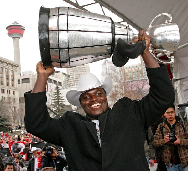 In that West Final against the B.C. Lions, the 6-foot, 285-pound Mr. Labinjo staged a one-man, goal-line stand. Twice, B.C. gave the ball to running back Ian Smart and twice Mr. Labinjo tackled him for a loss, forcing the Lions to kick a field goal instead of going for a touchdown. When the game ended 22-18 in Calgary’s favour, Mr. Labinjo’s heroics included three quarterback sacks, six tackles and a forced fumble.