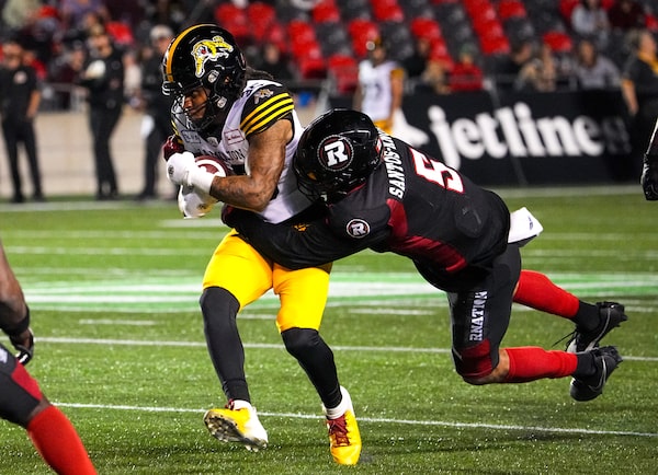 Hamilton Tiger-Cats' Tyreik McAllister, left, is tackled by Ottawa Redblacks' Jovan Santos-Knox during the first half in Ottawa. The Tiger-Cats won 27-24 on Sept. 8, 2023.Matt Zambonin/The Canadian Press