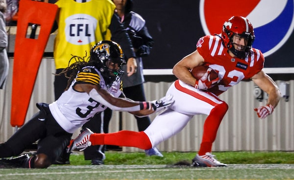 Hamilton Tiger-Cats defensive back Lawrence Woods, left, grabs for Calgary Stampeders receiver Tyson Middlemost during the second half in Calgary. The Ticats won 35-32 on Oct. 14, 2022.Jeff McIntosh/The Canadian Press