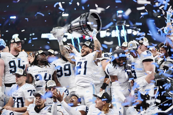 Toronto Argonauts' Daniel Adeboboye lifts the Grey Cup after defeating the Winnipeg Blue Bombers on Sunday.Darryl Dyck/The Canadian Press