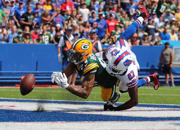 TreDavious White of the Buffalo Bills breaks up a pass to Reggie Begelton of the Green Bay Packers at Highmark Stadium on Aug. 28, 2021 in Orchard Park, New York.Timothy T Ludwig/Getty Images