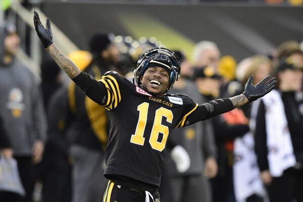 Hamilton Tiger-Cats wide receiver Brandon Banks celebrates on the sidelines during second half action against the Montreal Alouettes in the CFL Eastern Division final in Hamilton, Ont., on Sunday, Nov. 23, 2014.Frank Gunn/The Canadian Press