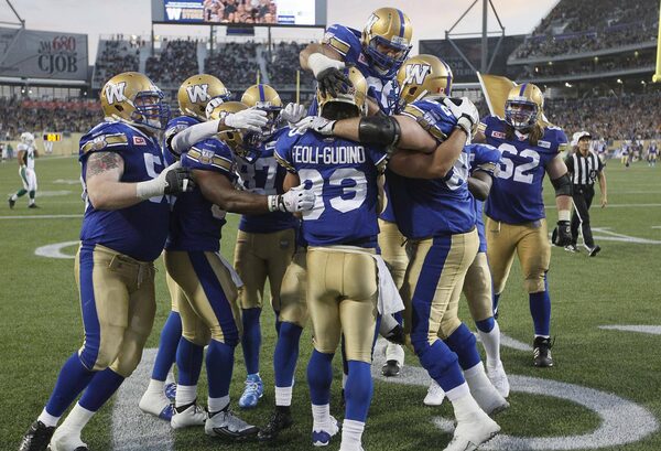 Winnipeg Blue Bombers celebrate with Julian Feoli-Gudino (83) after he runs the ball in for the touchdown against the Saskatchewan Roughriders during second half CFL action in Winnipeg Saturday, September 12, 2015.John Woods/The Canadian Press