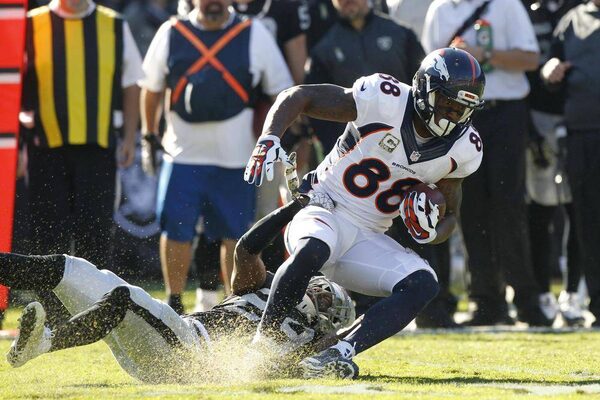 Denver Broncos wide receiver Demaryius Thomas is tackled after making a catch against the Oakland Raiders in the second quarter.Cary Edmondson
