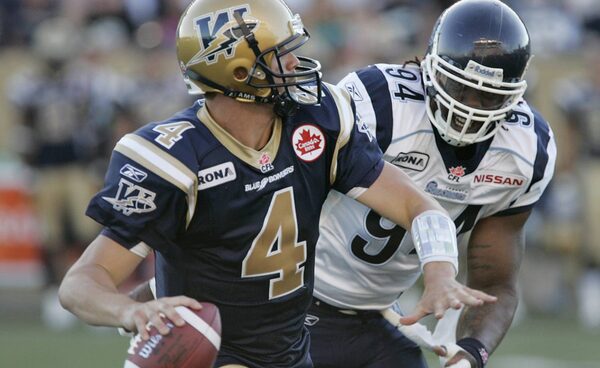 Toronto Argonauts' Kevin Huntley (94) applies pressure to Winnipeg Blue Bombers' Buck Pierce (4) in first half CFL action in Winnipeg, Friday, July 9, 2010. THE CANADIAN PRESS/John WoodsJohn Woods/The Canadian Press