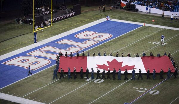 The Canadian flag is carried over the Buffalo Bills endzone before the Bills play the Atlanta Falcons in NFL action in TorontoMark Blinch/The Canadian Press