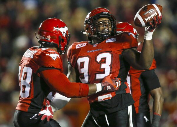 Calgary Stampeders' Micah Johnson, right, celebrates recovering a fumbled B.C. Lions football during second half CFL football action in Calgary, Friday, Sept. 18, 2015.Jeff McIntosh/The Canadian Press