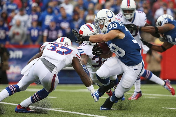 Indianapolis Colts running back Tyler Varga rushes the ball as Buffalo Bills’ Nickell Robey, left, defends during the first half at Ralph Wilson Stadium on Sept. 13 in Orchard Park, N.Y.Tom Szczerbowski/Getty Images